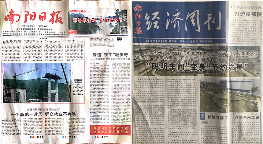 從智能制造到清潔生產(chǎn)、節(jié)能減排,一月內(nèi)《南陽(yáng)日?qǐng)?bào)》于8月11日、、8月29日連續(xù)兩次報(bào)道亞澳農(nóng)機(jī),河南衛(wèi)視《新聞聯(lián)播》聯(lián)動(dòng)報(bào)道。