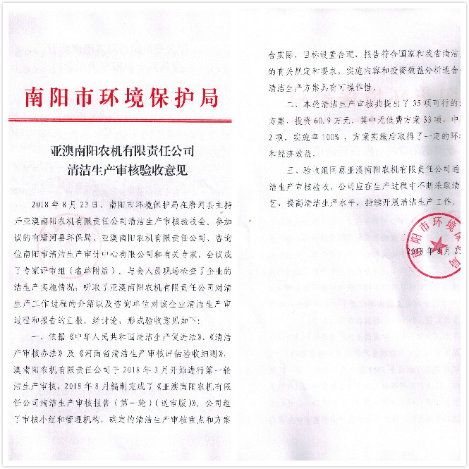 8月23日南陽市清潔生產(chǎn)審計中心攜權威認證專家對我公司清潔生產(chǎn)情況進行審核,會議上,專家對我公司清潔生產(chǎn)情況給予高度評價,一致認定亞澳農(nóng)機通過清潔生產(chǎn)審核,同時也為公司后續(xù)清潔生產(chǎn)提出一定要求及需改進的地方。我公司副總表示,接受專家們的建議,后續(xù)公司在清潔生產(chǎn)方面也將不斷改進。