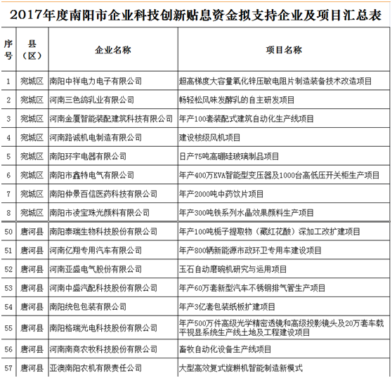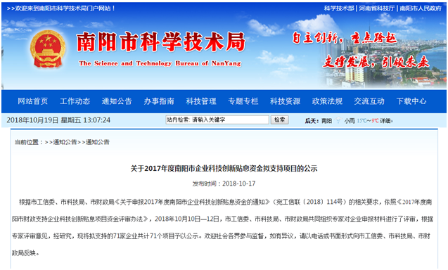 根據(jù)市工信委、市科技局、市財政局《關(guān)于申報2017年度南陽市企業(yè)科技創(chuàng)新貼息資金的通知》(宛工信聯(lián)〔2018〕114號)的相關(guān)要求,依照《2017年度南陽市財政支持企業(yè)科技創(chuàng)新貼息項目資金評審辦法》,2018年10月10日—12日,市工信委、市科技局、市財政局共同組織專家對企業(yè)申報材料進(jìn)行了評審,根據(jù)專家評審意見,經(jīng)研究,現(xiàn)將擬支持的71家企業(yè)共計71個項目予以公示。歡迎社會各界參與監(jiān)督,如有異議,請以電話或書面形式向市工信委、市科技局、市財政局反映。