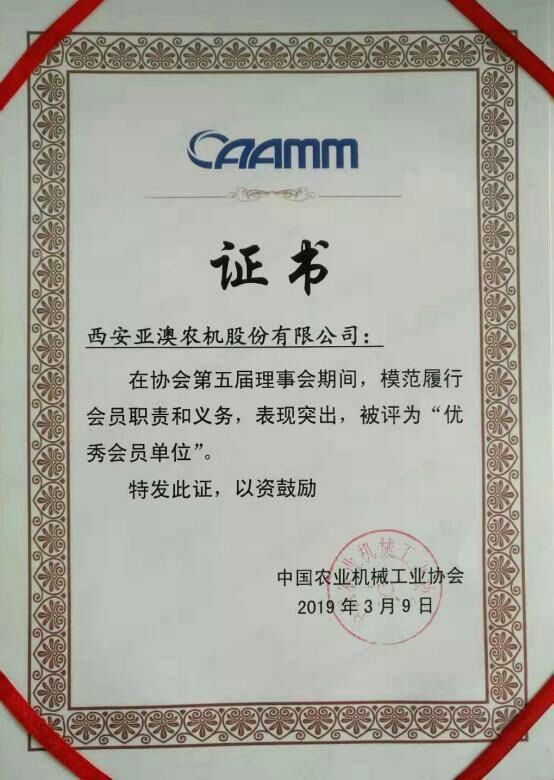 大會(huì)宣讀了中國(guó)機(jī)械工業(yè)聯(lián)合會(huì)《關(guān)于中國(guó)農(nóng)業(yè)機(jī)械工業(yè)協(xié)會(huì)理事會(huì)換屆的批復(fù)》。審議通過(guò)了陳志會(huì)長(zhǎng)代表協(xié)會(huì)第五屆理事會(huì)作的《中國(guó)農(nóng)機(jī)工業(yè)協(xié)會(huì)第五屆理事會(huì)工作報(bào)告》和侯慶忠執(zhí)行副會(huì)長(zhǎng)作的《中國(guó)農(nóng)機(jī)工業(yè)協(xié)會(huì)第五屆理事會(huì)財(cái)務(wù)收支情況報(bào)告》,審議通過(guò)了《中國(guó)農(nóng)業(yè)機(jī)械工業(yè)協(xié)會(huì)章程》,選舉產(chǎn)生了中國(guó)農(nóng)業(yè)機(jī)械工業(yè)協(xié)會(huì)第六屆理事會(huì)和第一屆監(jiān)事會(huì)。 為表彰協(xié)會(huì)五屆理事會(huì)履職以來(lái),為推進(jìn)農(nóng)機(jī)工業(yè)技術(shù)進(jìn)步和健康發(fā)展做出積極貢獻(xiàn)的優(yōu)秀集體和個(gè)人,會(huì)議還授予侯慶忠等10人為“優(yōu)秀協(xié)會(huì)工作者”,授予企業(yè)管理委員會(huì)等5個(gè)分支機(jī)構(gòu)為“先進(jìn)分支機(jī)構(gòu)”,授予西安亞澳農(nóng)機(jī)股份有限公司等33家單位為“優(yōu)秀會(huì)員單位”。 亞澳農(nóng)機(jī)總經(jīng)理史森強(qiáng)應(yīng)邀參會(huì)并參加相關(guān)活動(dòng)。榮獲“優(yōu)秀會(huì)員單位”是協(xié)會(huì)對(duì)亞澳多年來(lái)投身農(nóng)機(jī)事業(yè)的充分肯定和高度認(rèn)可,亞澳也將以此為契機(jī),不忘初心、篤定前行,為促進(jìn)我國(guó)農(nóng)機(jī)產(chǎn)業(yè)轉(zhuǎn)型升級(jí),推動(dòng)我國(guó)農(nóng)業(yè)全程全面機(jī)械化做出新的更大貢獻(xiàn)。