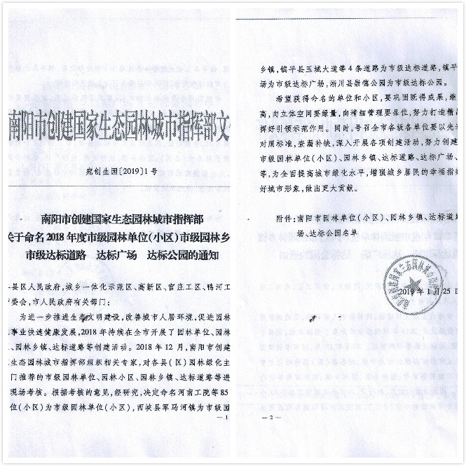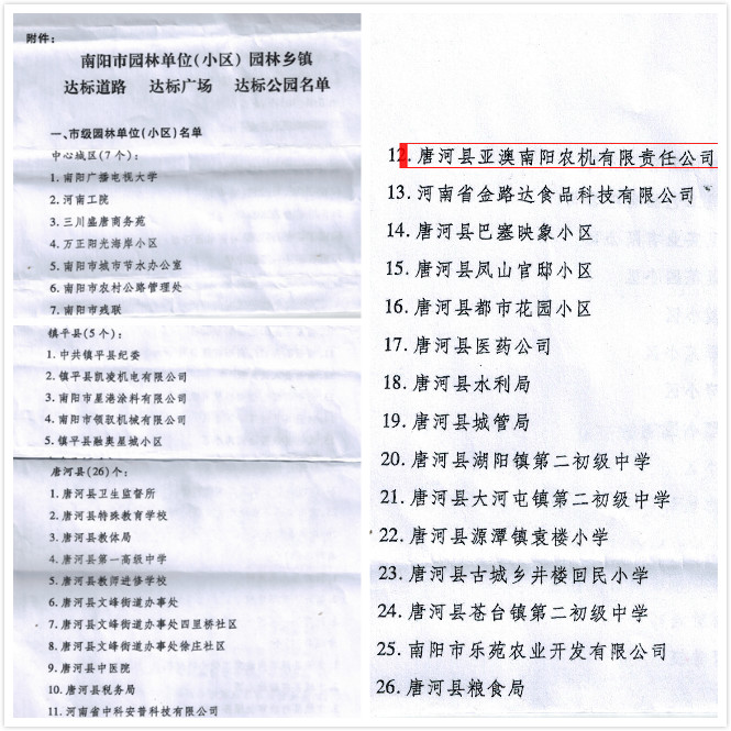 近日,南陽市公布了2018年度全市園林式居住區(qū)(單位)評(píng)選結(jié)果,亞澳南陽農(nóng)機(jī)有限責(zé)任公司榜上有名,榮獲市級(jí)“園林式單位”榮譽(yù)稱號(hào)。