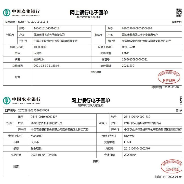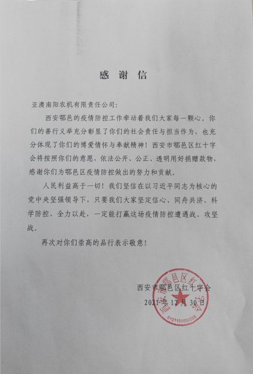 十二月份,一場(chǎng)突如其來(lái)的疫情打亂了西安人平靜的生活,面對(duì)日趨嚴(yán)峻的疫情態(tài)勢(shì),亞澳農(nóng)機(jī)作為一家有社會(huì)責(zé)任感的企業(yè)積極奉獻(xiàn)自己力量,亞澳農(nóng)機(jī)南陽(yáng)公司為鄠邑區(qū)紅十字會(huì)捐款100000元,亞澳農(nóng)機(jī)總公司為鄠邑區(qū)甘亭街道東韓村捐款40000元,亞澳農(nóng)機(jī)與社會(huì)各界人士并肩作戰(zhàn),為疫情防控工作貢獻(xiàn)自己的一份薄力。